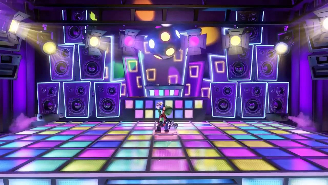 The Dance Hall is a fairly linear stage that's mostly a hallway leading to a glamorous dance floor. The aesthetic style seems to be based on retro discos from the 1960s - 1980s, with bright neon LED's and tube lights mounted everywhere on the floor. The shops and secret areas on this floor have pink walls with a black and white checkered floor, matching a lot of backstage designs of real clubhouses and discos. Along the stairway to the dance floor, there is graffiti painted on the walls. While mostly based on 60's-80's disco and funk, there is a accent of late 80's hip-hop running through the floor as well, as the dancing Goobs wear attire popular in that era of music. The small dining areas on the sides of the dance floor have swivel diner chairs that were popular in many bars from the 50's-90's. Record disc imagery is seen in a lot of places in this stage too, from interactive turntables on the walls, to even ceiling decor.