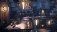In the lower area of the Library is a small side room behind the shelves on the northwest. In this room is a big yellow book with a red line in the middle above one shelve. Luigi must vacuum it and transport it to the upper area of the Library.