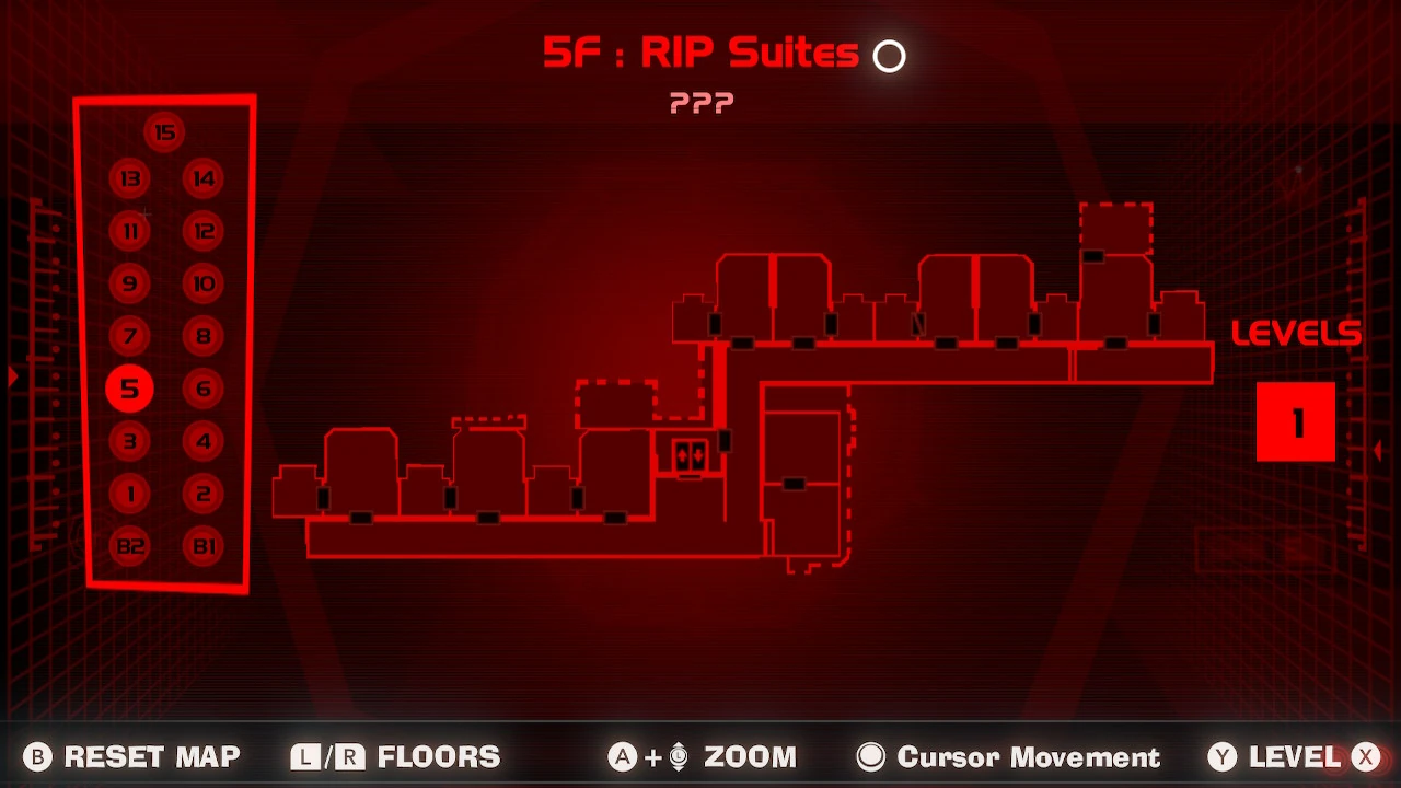 The RIP Suites are the 5th floor in the game, accessed by beating Steward in B1 and for the end of the prologue. It consists of two hallways, leading off to several hotel rooms. There is also what appears to be a mini-lounge and a laundry room. The boss fought here is Chambrea.