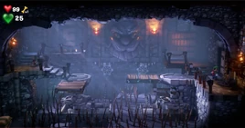 While this floor appears to be a standard medieval castle, it's likely a medieval reenactment area used for entertainment, not an actual castle, as real castles did not contain booby traps. The floor being centered around the Coliseum, the arena itself, the cardboard cut-out audience and the entrance gates with a ticket stand are evidence of this. There are lots of armour stands with swords and chilvery all over the floor, with banners and flags of King MacFrights on display too. Several spikes and pendulum axes litter this floor, which Gooigi is immune to. There are also armed hooded archers that will repeatedly shoot at Luigi.