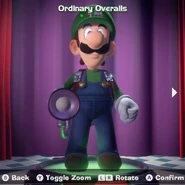 This is the default costume that Luigi wears in the game and also his trademark outfit in the different video games of the Mario franchise, also being the one he also uses in all the Luigi's Mansion games.