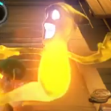 Before Director Morty begins to edit the movie starring Luigi, if the player enters this room, they can turn on an animation of a ghost in the monitor, they only need to spin the film reels with the Poltergust G-00. In the cartoon, a Goob will be shown doing a walk animation while getting closer to the screen, when it's close enough, it will end up coming out of the monitor, revealing a golden Goob, which their colors couldn't be recognized at first by the black and white of the monochromatic video. |