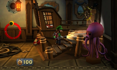 The Nautical Exhibit are two consecutive rooms of the Treacherous Mansion in Luigi's Mansion: Dark Moon. The main part of the Nautical Exhibit is a room themed around ships and sails, and also contains sea animals like fish, and a E-Gate on the northern wall, which leads to the Front Entrance, and the room can be accessed via the door from the East Corridor. There is also a octopus statue that can be interacted with that slaps Luigi, dealing 2 points of damage. There is also a compass on the ground which is controlled by the western wheel, and flips the E-Gate to the Study. Behind the sail on the ship to the eastern side is a door, which leads to a ship outside, with crows, golden crows and a treasure chest with a diamond.