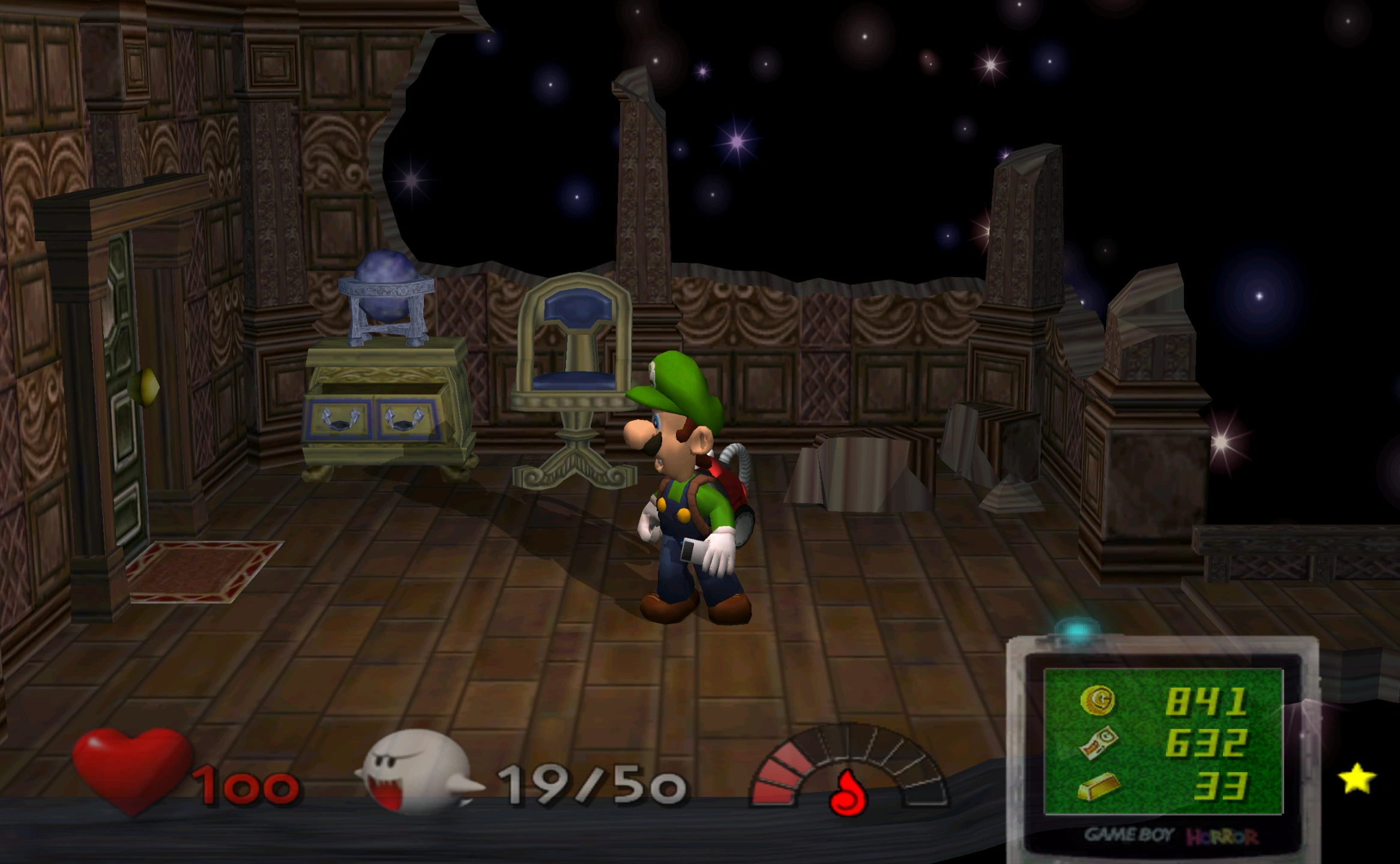 After successfully exiting the Astral Hall, Luigi founds himself in the Observatory. He notices an antique-looking telescope in the room and decides to look through it. Through the view, Luigi can see the Moon. After he has finished looking at the telescope, the walls in the room mysteriously fade away, allowing Luigi to step out on a small balcony. Small bright yellow Meteor Ghosts will be falling outside, and Luigi decides to suck one up and shoot it at the Moon. The Moon subsequently exploded, and a winding, ephemeral bridge appeared, allowing Luigi to step out into space and retrieve Mario's Star, the third item he would need to take to Madame Clairvoya. After the Observatory walls vanished and Luigi got his brother's star, he notices that the telescope that he previously looked through turned into a pile of crumbled walls and will no longer be able to see into "space" when the room is already cleared.