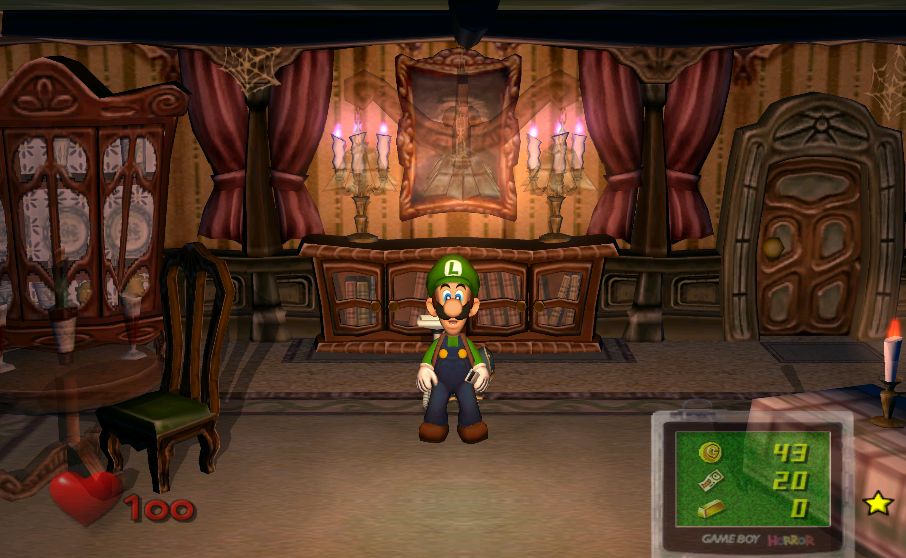 After training at the lab, Luigi enters the Parlor again to find his brother. If the player puts out all the candles in the room, the paintings talk to Luigi and warn him about what's coming. Then three Gold Ghosts attack Luigi, and he must defeat them to get the key to the Anteroom.