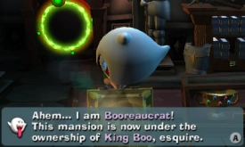 Booreaucrat | 40 | E-3: A Train to Catch | Dark Age Exhibit | Using a Balloon Berry from the Study, fly to the top of the Dark Age Exhibit (use portals to get there). On the right side will be a Gold Balloon Berry. Collect all the coins in the shape of a Boo, and open the treasure chest that appears as a "reward". The Boo will be inside. | American: "Ahem... I am Booreaucrat! This mansion is now under the ownership of King Boo, esquire. I take it you have the proper credentials to be here, including ID and a mansion-roaming license? No? That's...unfortunate. You'll have to be penalized!" British: "Ahem... I am Booreaucrat! This mansion is now under the ownership of King Boo, Esquire. Are you authorised to be here? Your identification and mansion roaming permit, please. You don't have them? That's...unfortunate. I have no choice but to penalise you." |