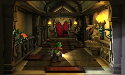 The West Corridor is the first room that Luigi explores in the Treacherous Mansion. The background music that plays in this room is a slightly altered version of the Tough Possessor's giant statue armor phase from "Stop the Knightmare" from Dark Moon.
